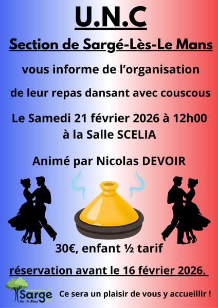 L’UNC vous convie, le 21 février 2026 à 12h00, à participer à son repas dansant autour d’un couscous, à la salle SCELIA, animé par Nicolas DEVOIR. Réservation obligatoire avant le