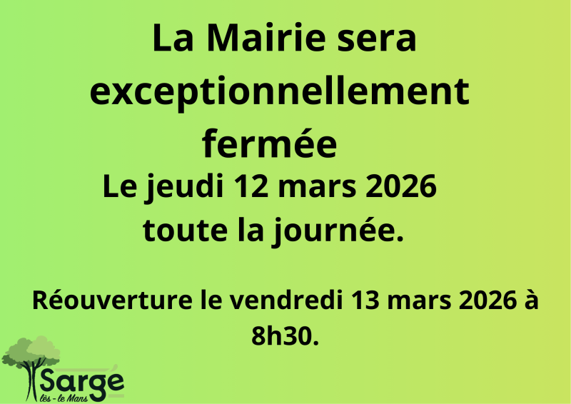 La Mairie sera exceptionnellement fermée le jeudi 12 mars 2026 toute la journée. Réouverture le vendredi 13 mars 2026 à 8h30.