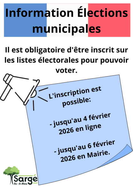Élections municipales : Il est obligatoire d’être inscrit sur les listes électorales pour pouvoir voter. L’inscription est possible: – jusqu’au 4 février 2026 en ligne– jusqu’au 6 février 2026 en