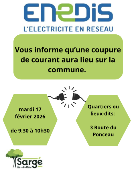 Enedis vous informe qu’une coupure de courant aura lieu le 17 février 2026, au 3 route du Ponceau, de 9h30à 10h30.