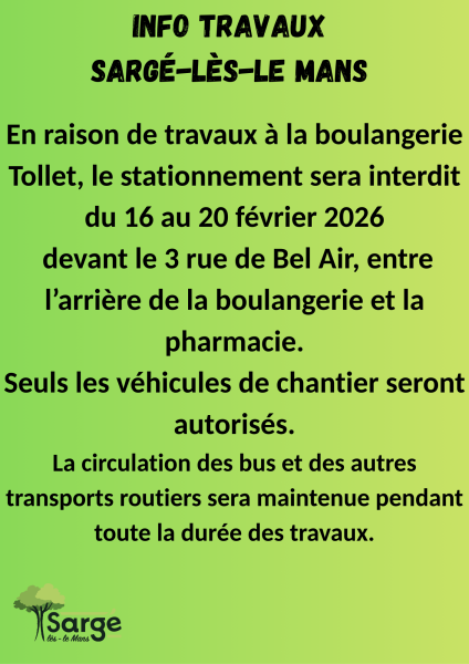 INFO TRAVAUX :En raison de travaux à la boulangerie Tollet, le stationnement sera interdit du 16 au 20 février 2026