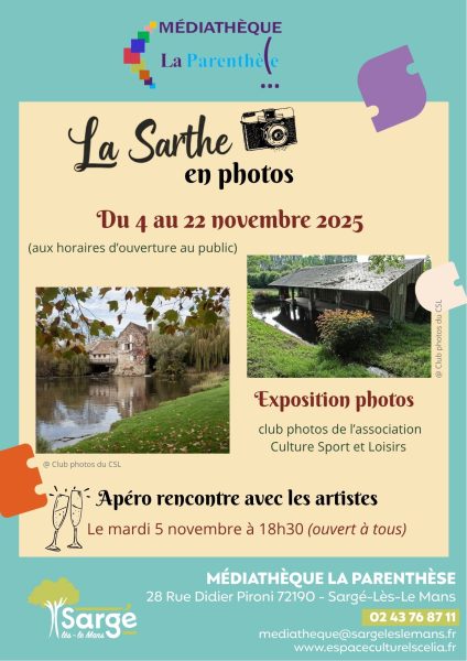 La Médiathèque La Parenthèse propose une exposition LA SARTHE EN PHOTOS: du 4 au 22 novembre 2025 Apéro rencontre avec les artiste le mardi 5 novembre 2025 à 18h30- ouvert