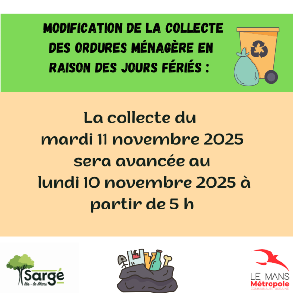 La collecte du mardi 11 novembre 2025 sera avancée au lundi 10 novembre 2025 à partie de 5 heures.