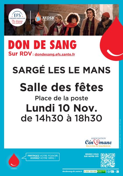 Don du sang – Lundi 10 novembre 2025 : Une collecte de sang auras à la salle des fêtes, de 14h30 à 18h30. Pensez à prendre rendez-vous dès maintenant sur