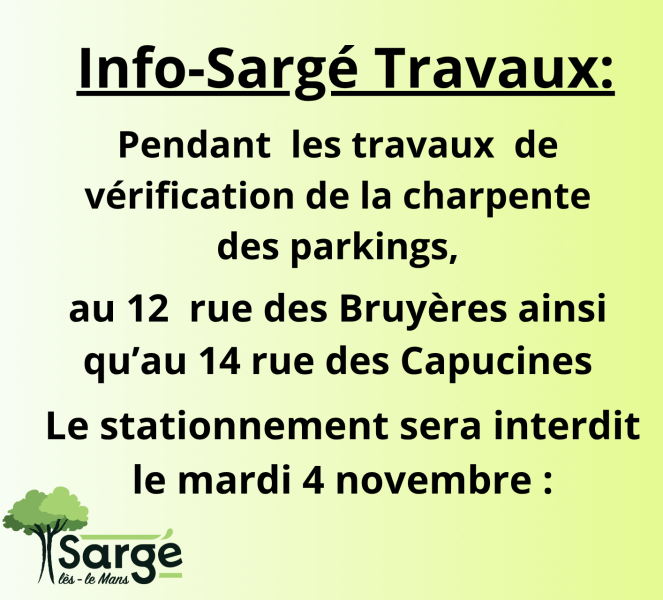 Pendant les travaux de vérification de la charpente des parkings, au 12 rue des Bruyères ainsi qu’au 14 rue des Capucines le stationnement sera interdit le mardi 4 novembre.