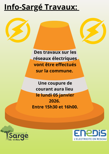 Des travaux sur les réseaux électriques vont être effectués sur la commune. Une coupure de courant aura lieu le lundi 05 janvier 2026 entre 15h30 et 16h00.