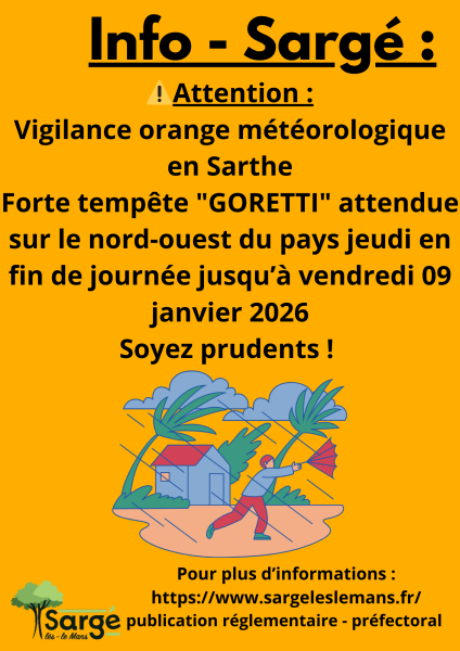 Forte tempête “GORETTI” attendue sur le nord-ouest du pays jeudi en fin de journée jusqu’à vendredi 09 janvier 2026 Soyez prudents ! Pour plus d’informations : https://www.sargeleslemans.fr/ publication réglementaire –