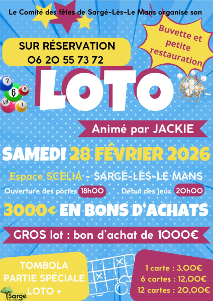 Attention sur réservation : LE COMITÉ DES FÊTES DE SARGÉ : organise le samedi 28 février 2026 à l’espace SCELIA un loto. Ouverture des porte 18h00 / début des jeux
