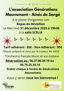 L’association Générations Mouvement – Aînés de Sargé. A le plaisir d’organiser son Repas du Réveillon Le Mercredi 31 décembre 2025 à 19h30 à la salle SCELIA. Tarif adhérent : 85€