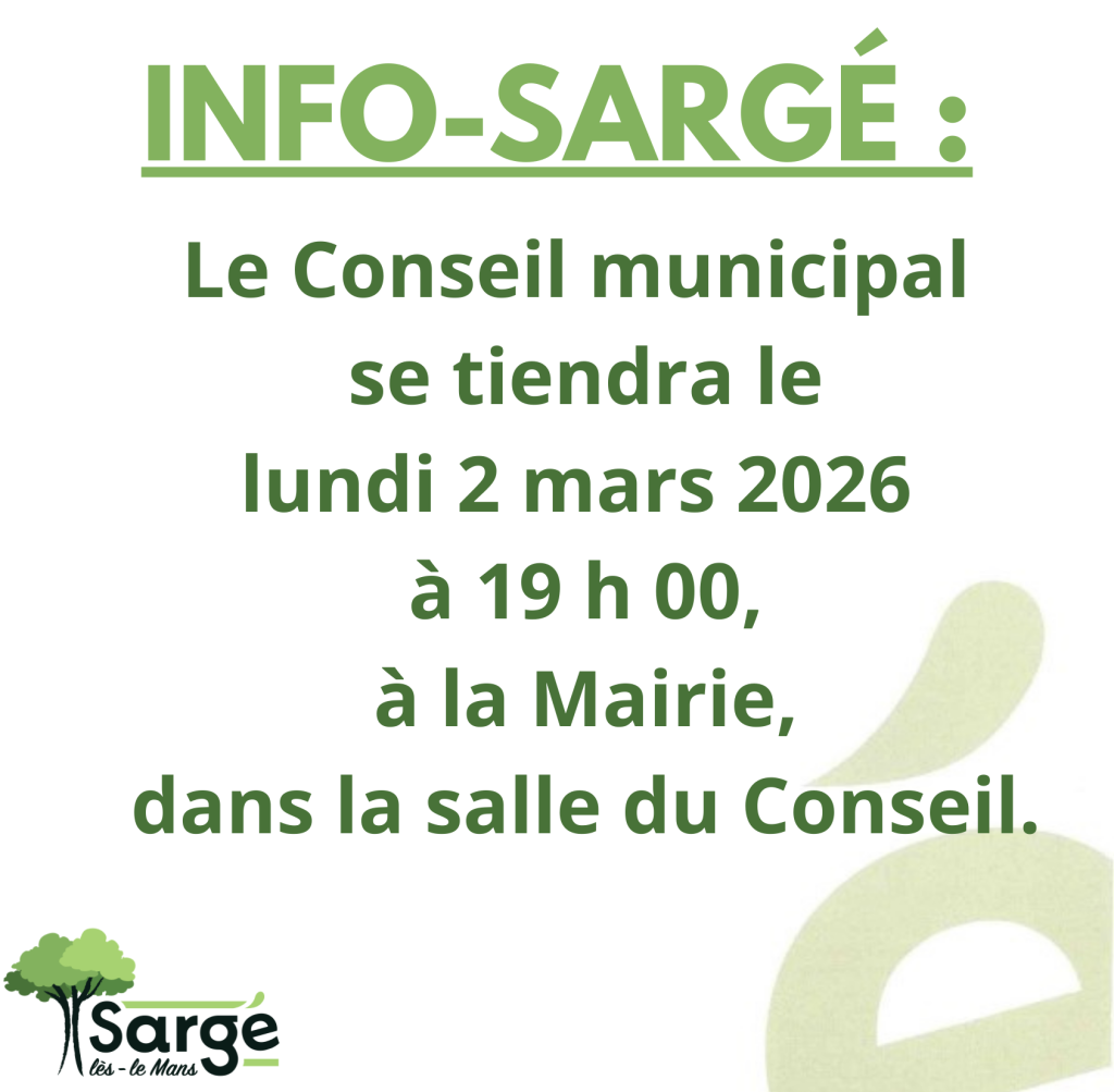 Le Conseil Municipal se réunira le lundi 02 mars 2026 à 19h00, dans la salle du Conseil de la Mairie.