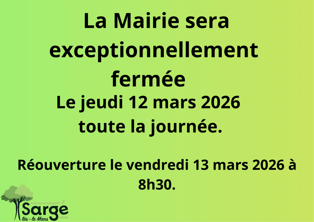 La Mairie sera exceptionnellement fermée le jeudi 12 mars 2026 toute la journée. Réouverture le
