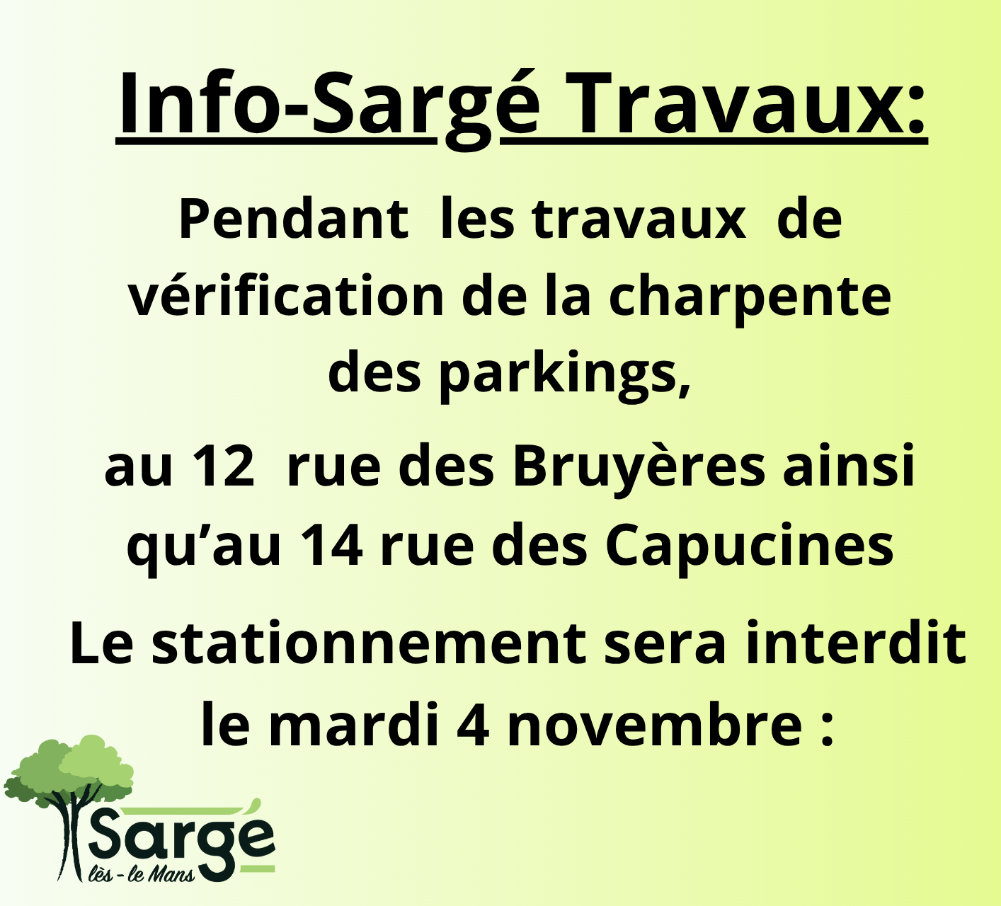 Pendant les travaux de vérification de la charpente des parkings, au 12 rue des Bruyères ainsi qu’au 14 rue des Capucines le stationnement sera interdit le mardi 4 novembre.
